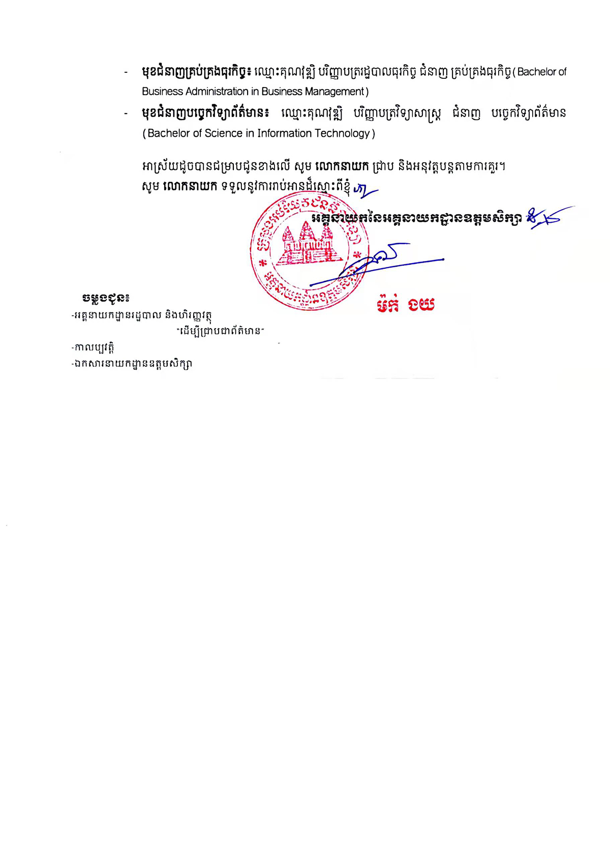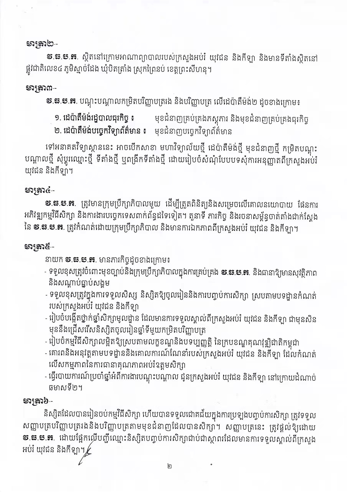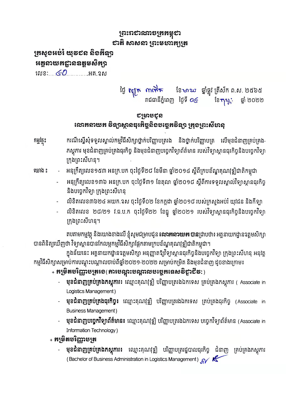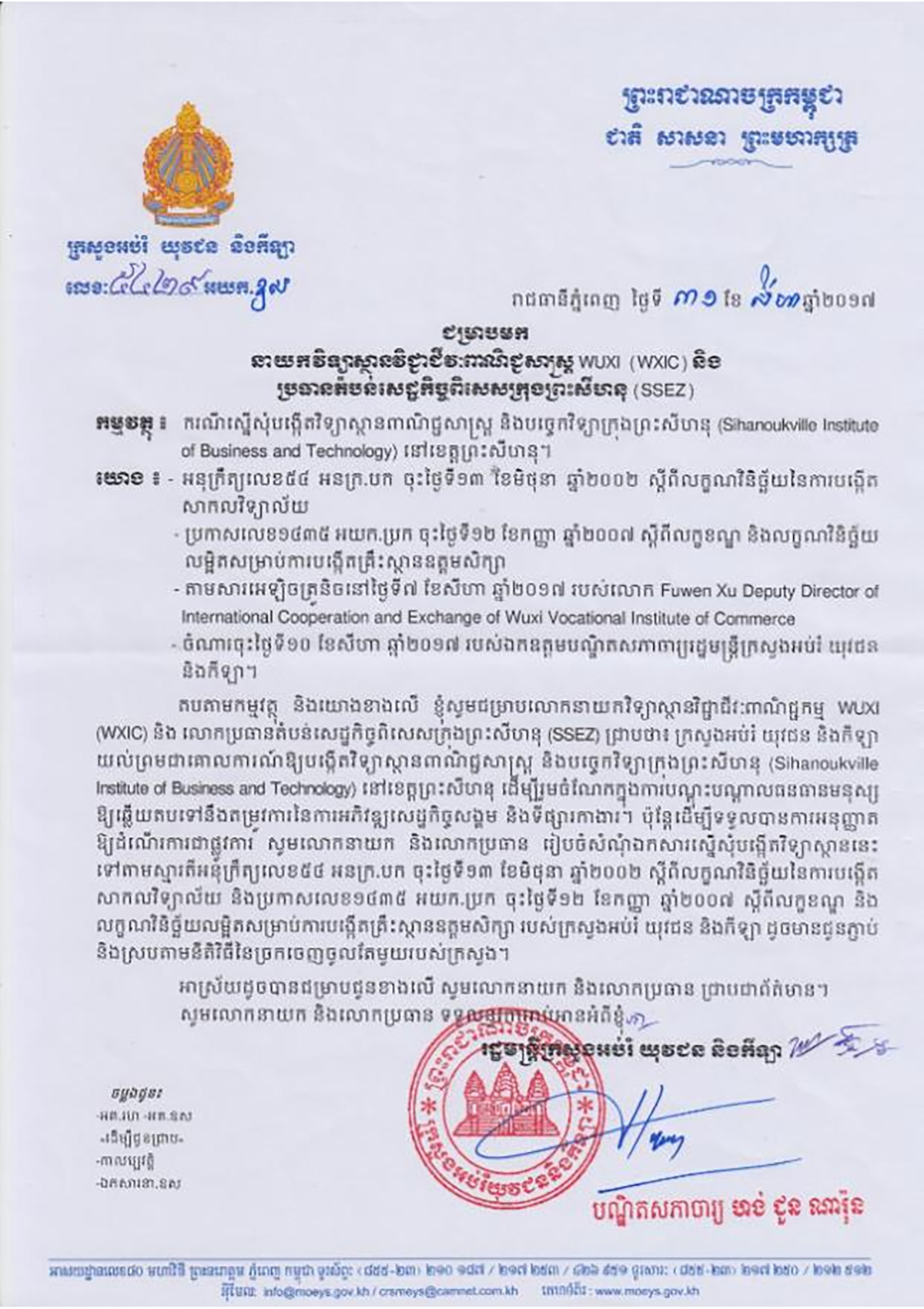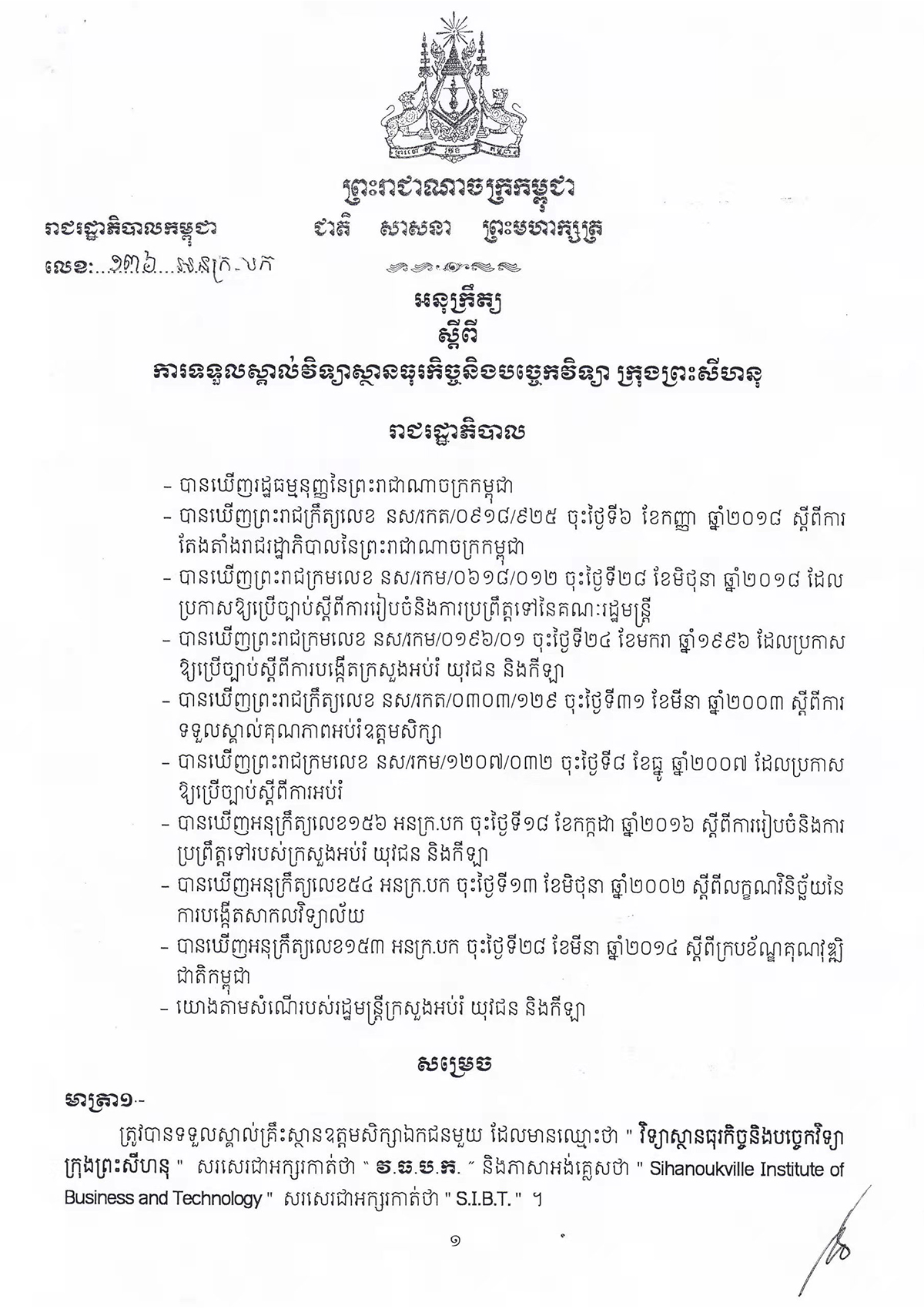 Sihanoukville Institute of Business and Technology (SIBT) is a private higher education institution approved by the royal government of Cambodia under Sub-Decree No. 136, under the supervision of Ministry of Education, Youth and Sport of Cambodia. The Institute, located in the Sihanoukville Special Economic Zone (SSEZ), is the first Chinese featured higher education institution established in Cambodia, with Chinese language as one of its major teaching and working languages. With the generous support of governments, enterprises and social organizations in Cambodia and China, the Institute focuses on strengthening higher education, vocational training, scientific and technological services, and cultural exchanges between China and Cambodia.
