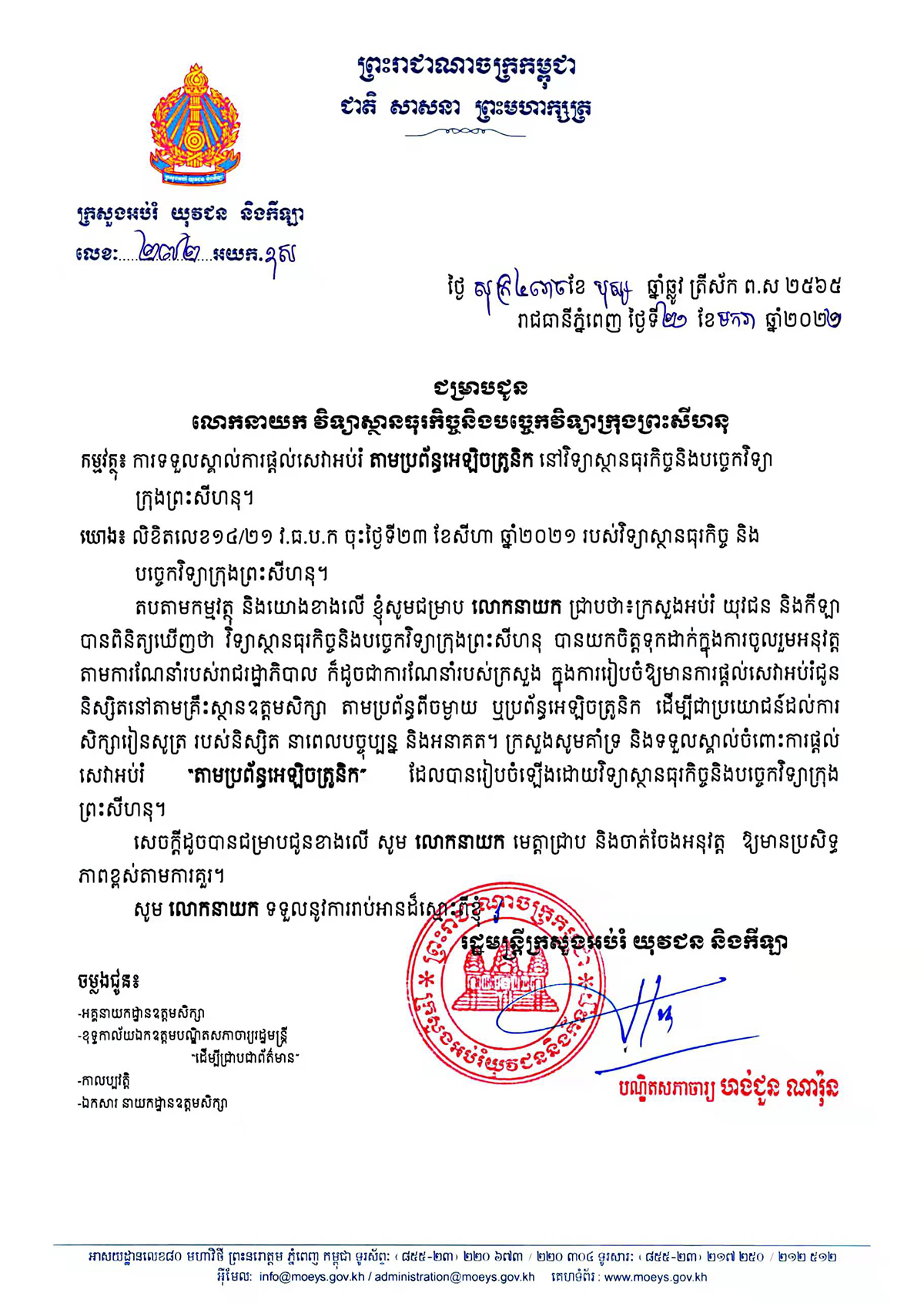 SIBT is a private Chinese higher education institution established in Preah Sihanouk Province, Cambodia. The Institute has been recognized and officially approved to its own operations by Royal Government of Cambodia through Sub-Decree No. 136. The Institute is under the supervision of The Ministry of Education, Youth and Sports of Cambodia.